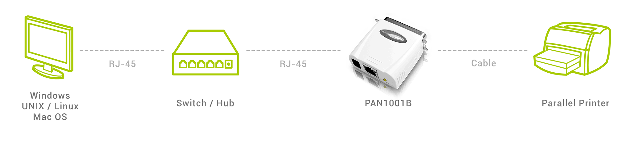 - All that is needed is to connect the PAN1001B to a printer via the parallel port, connect the print server to your LAN, and you will be able to access your printer from any computer on the LAN.